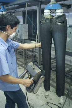 a) 在洗水前,通過使用砂輪滾動摩擦而使布面染料褪色,手擦的地方通常是脾位和臀位,人為的機械褪色,讓牛褲在洗水后顯得自然地懷舊和泛白hFz臭氧發生器_臭氧消毒機_臭氧水機_制氧機_廣州佳環電器【官網】